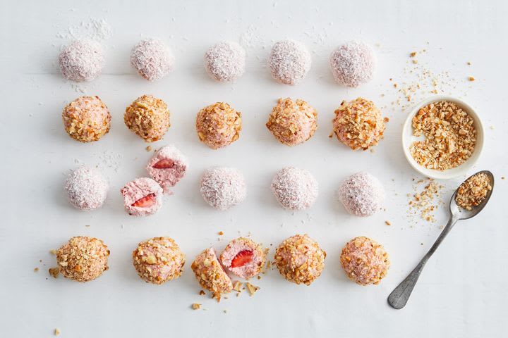 Line a baking sheet with parchment paper. Cut the reserved strawberries in half lengthwise, then into quarters. Place a fresh strawberry in the center of a level tablespoon of the chilled cheesecake mixture. Form a ball and place it on the prepared tray. Repeat with the remaining strawberry mixture and strawberry pieces.