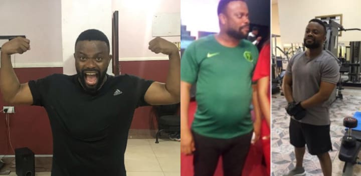 Popular Nollywood actor and comedian, Emem Bishop Umoh popularly known as Okon Lagos, shocked fans when he posted a picture of his signature pot belly missing, replaced by a flat stomach and a trainer by his side.