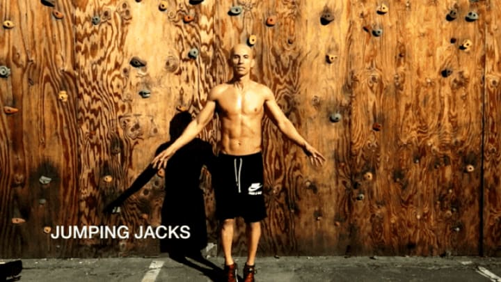 Key points: Jump your feet out while raising your hands overhead, landing with a slight bend in the knees to absorb the impact.