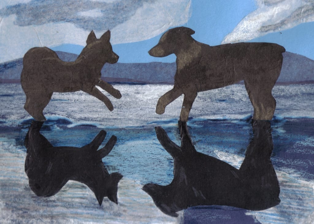 Since I work in a library, I get to see a lot ofbooks come in and go out of the library. One day I was checking in some returned books and saw a book on creating collages. I checked it out and decided to give the new medium a try. I looked at the list of tools and I had most of the items already. I immediately pulled out my trusty Fiskars Micro Tip scissors and got started creating. My first attempt was a collage using tissue paper and colored pencil. It was of two of my dogs playing on a beach. The idea for my picture came from a friends photo. On a vacation she'd taken a picture of her dogs at the beach with their reflection in the water. She gave me permission to use the idea so I altered some of the background and added my dogs. For a first attempt it wasn't too bad.