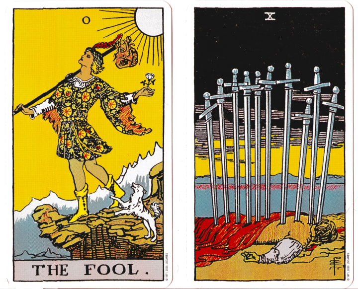 Something else I did differently today was in my mediation with the cards. For the past week or so I’ve been trying to keep my mind blank as I shuffled. My hope was that I would get readings that were not about any one person or event. What I found though was that the cards still gave me messages that were for me. So today, As I held the cards in my hands, I thought about using the date as an intention. I thought for a few minutes about the date January 23, 2023. I mulled over it for a bit. As I shuffled I repeated the date, “Monday, January 23, 2023.” The two cards that fell out of the deck were The Fool and the 10 of Swords.