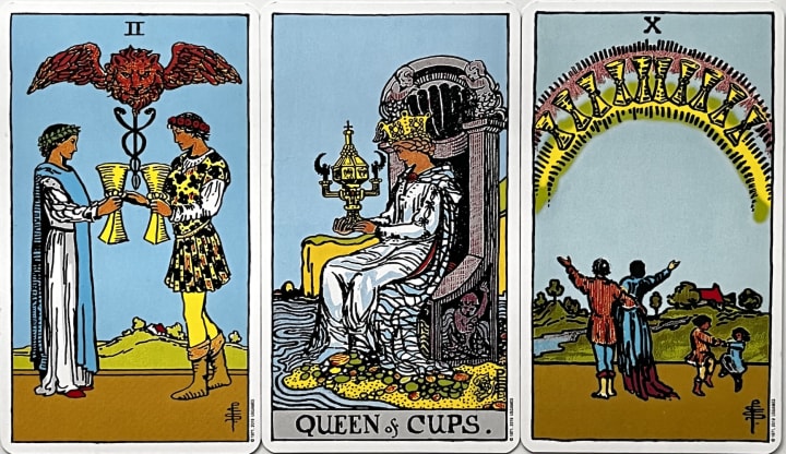 First off, I have to say that you’ll probably notice that all of our cards in today’s reading are cups. All except the takeaway, which we’ll see later. This week will be pretty emotional. The Two of Cups shows two people standing, facing each other. The woman on the left wears a white dress and blue tunic, while the male wears a multicolored tunic. They both have wreaths on their heads, each holding their cup. The male is reaching out to the woman. The head of a winged lion hovers above them. Between them are two snakes wrapped around a stake.