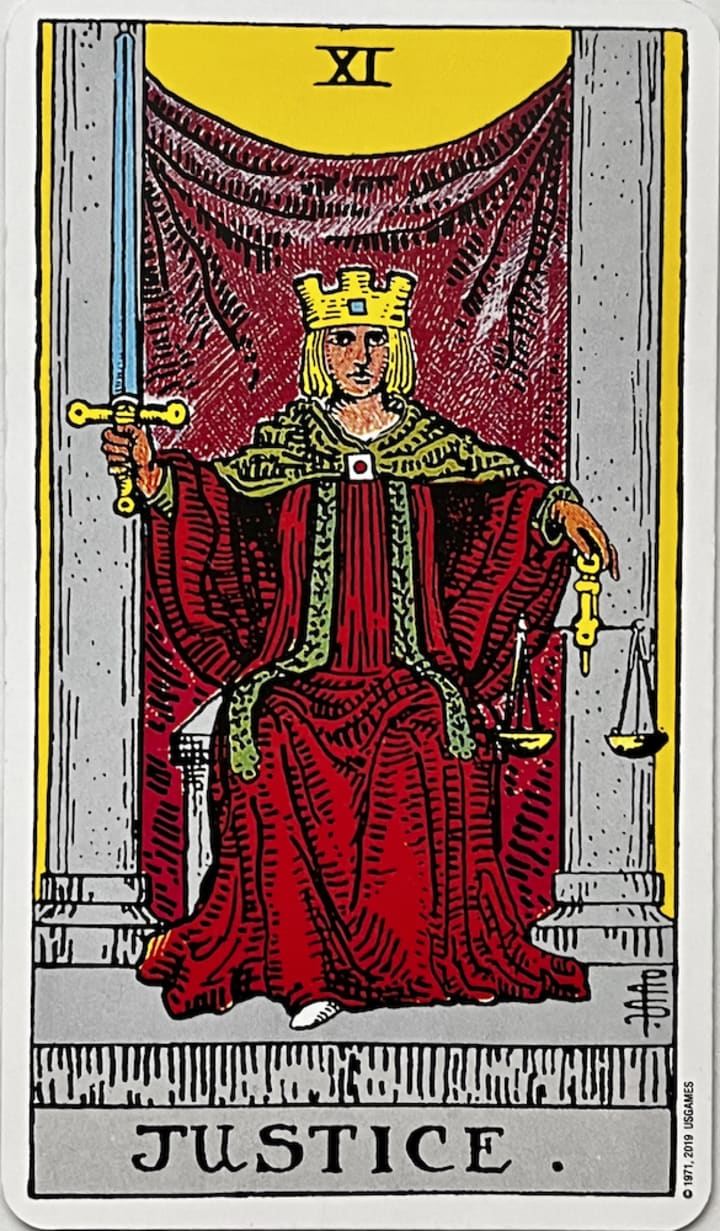 Our takeaway card for this coming week is Justice. She sits on a stone slab between two pillars. Between the pillars is a red curtain. And her robes are also red. She holds the scales in her left hand and a sword in her right.