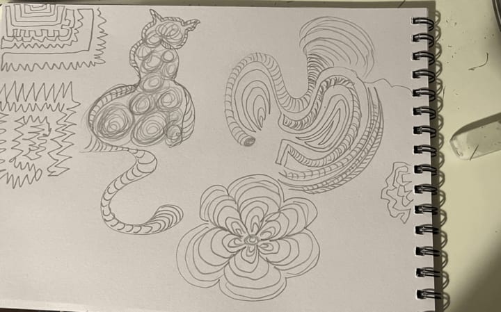 If you are unsure how to start, I suggest beginning with simple, free drawing; it's a relaxing way to get ideas down on paper. Begin with your writing instrument in the centre of a new, blank sheet of paper and draw long, free lines without pausing. Fill in the entire page first, then go back and fill in any significant shapes that jump out.