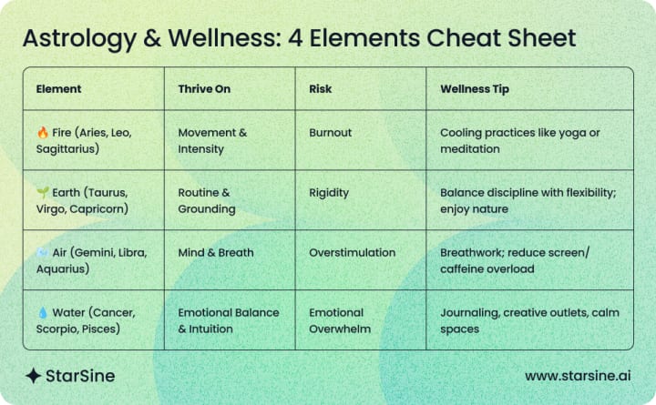 - Fire (Aries, Leo, Sagittarius): High energy, passion, and movement. These signs thrive with activity and expression but risk burnout if they push too hard.