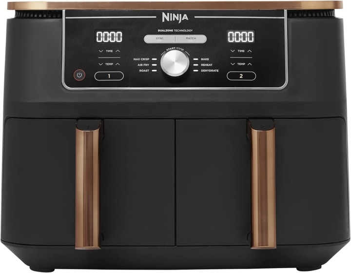 The Ninja Foodi MAX Dual Zone Air Fryer (Amazon Exclusive) is a versatile and powerful kitchen appliance designed to cater to various cooking needs. With its 9.5-liter capacity, it features two independent drawers, allowing users to cook different dishes simultaneously. This 6-in-1 air fryer can air fry, Max Crisp, roast, bake, reheat, and dehydrate, providing a wide range of cooking options. The use of hot air circulation eliminates the need for oil, resulting in healthier meals. The nonstick, dishwasher-safe baskets make cleanup easy, and the appliance's sleek copper/black design adds a stylish touch to any kitchen. Perfect for preparing up to eight portions, the Ninja Foodi MAX Dual Zone Air Fryer is ideal for families or entertaining guests.