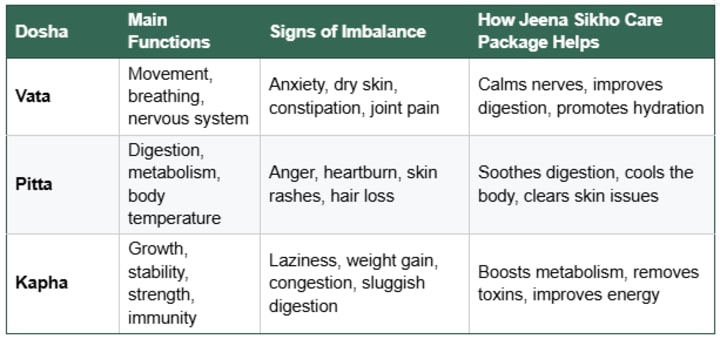 The Jeena Sikho Care Package, also known as the Vata Pitta Kapha package, is a comprehensive package for maintaining healthy well-being.
