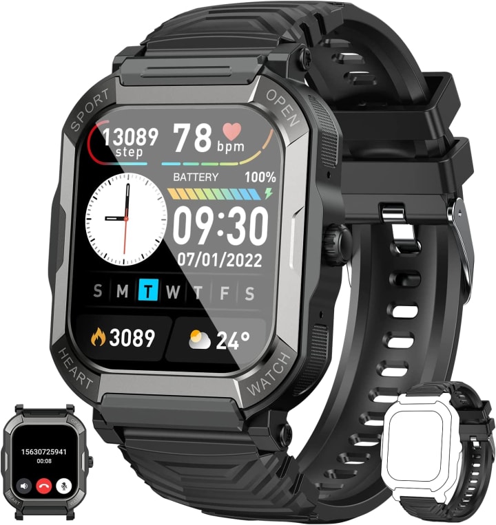 The smartwatch is designed to withstand various environmental conditions, making it suitable for outdoor activities and rugged use. Its special composite materials have undergone rigorous testing, including temperature, low pressure altitude, dustproof, salt spray, and fluid contamination tests. It has also passed drilling, crushing, and hot steam scouring tests, ensuring its durability and suitability for high-temperature and high-pressure environments. Whether you're engaging in intense workouts or outdoor adventures, this military-grade smartwatch will be your reliable companion.