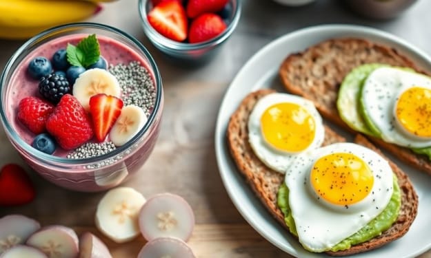 Breakfast: Oatmeal with berries and nuts, Greek yogurt with fruit and granola, or a whole-wheat toast with avocado and egg.