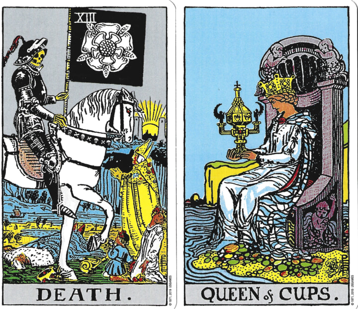 Today I did as I always have, shuffled the cards, and meditated on today’s date, January 27, 2023. The cards that came to me for today are Death and the Queen of Cups.