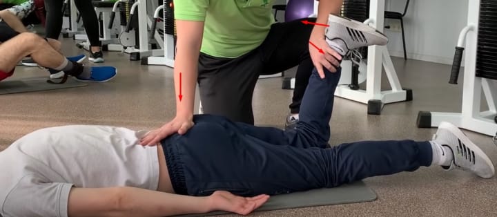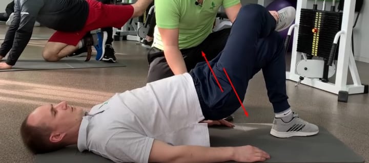 The patient lies in a supine position, with his hand resting on the ankle joint and asking the patient for a heel reach the buttock (bend the leg for resistance). We create resistance exactly at the time when the patient tries to bend the leg, but we create such resistance so that for the first time it is comfortable for the patient so that the exercise does not cause pain in the lumbar, especially in the buttock.