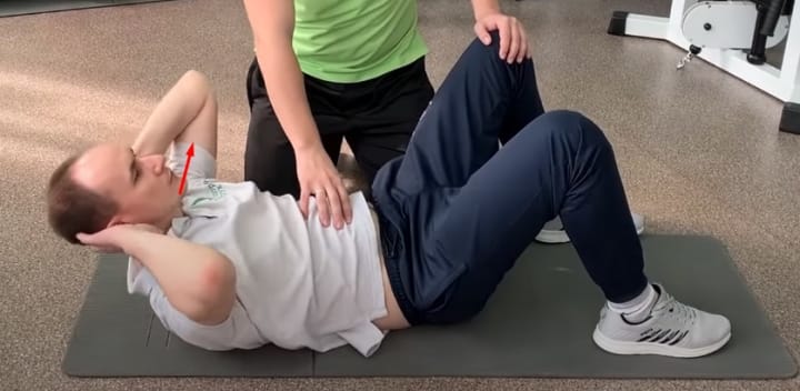 A big mistake is when the patient begins to tear the pelvis off the floor (lift the buttocks), thereby increasing even more lordosis. It is important to control this, so the assistant should put his hand on the coccyx and trying to hold the pelvis down. The average performance of the exercise is 15-20 reps.