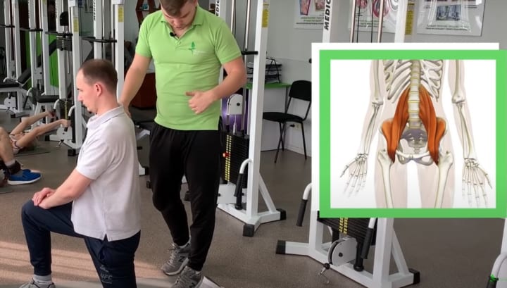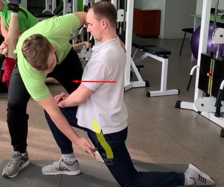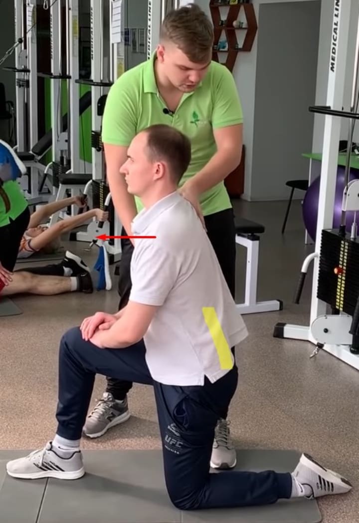 The starting position is standing on one knee, the second leg is bent forward, moving the body forward, stretched, that is, you should feel a stretch in the area of the front surface of the thigh of the leg, which is on the knee. Back to starting position. When performing the exercise, you can slightly twist the case forward so that you do not have so much involved in lordosis. Average exercise 15-20 reps for well-being or more or less.