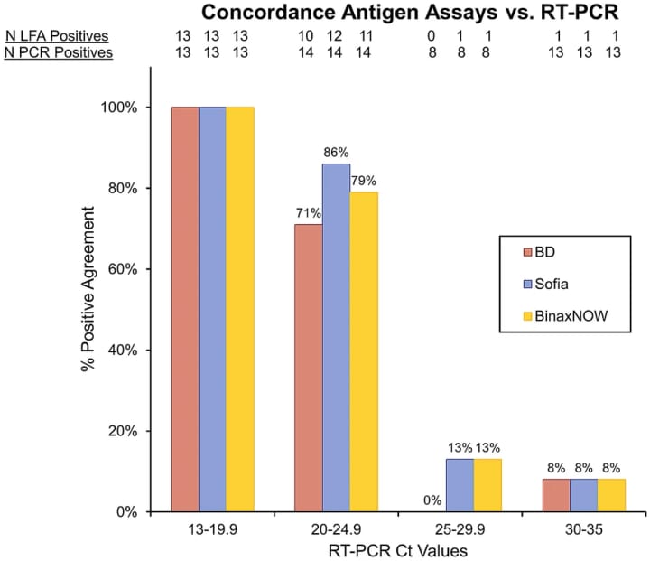 Ct values in the 13-19.9 range indicate an extremely high level of virus and the fact that so many clinical samples showed these low Ct values is alarming in and of itself, however, that not notwithstanding, the key takeaway is that lower Ct equals higher input viral load into the test. At those high virus levels one would expect the rapid antigen methods to easily detect the virus just as the qPCR method does and in fact that is what you do see. 100% agreement between the rapid antigen methods and RT-qPCR. However, as Ct values trend upwards (remember that means lower concentration of virus present) we start to see rapid antigen method negatives that were easily positive by qPCR. As a qPCR expert I am frankly shocked at the fact that the rapid antigen methods are missing qPCR positives in the 20-25Ct range. Those Ct values are still indicative of very high levels of virus and I would have expected them to be easily detected as well by just about any method one could dream up. The fact that they are not is very worrisome indeed. Even Ct values of 25-30 indicate a reasonably high viral load and the fact that only 0-13% of positive PCR samples were called positive by a rapid antigen method is shocking and disturbing. These are real world clinical samples, not artificially inoculated test samples. The results of those tests are described in other parts of the paper and they tell a similar tale. Rapid antigen method sensitivity is terrible and has continued getting worse with each successive variant. This is not all that surprising given the predicted impacts of the known mutations of each of the variants but I don't think anyone predicted the sensitivity drop off to be as dramatic as it has been.