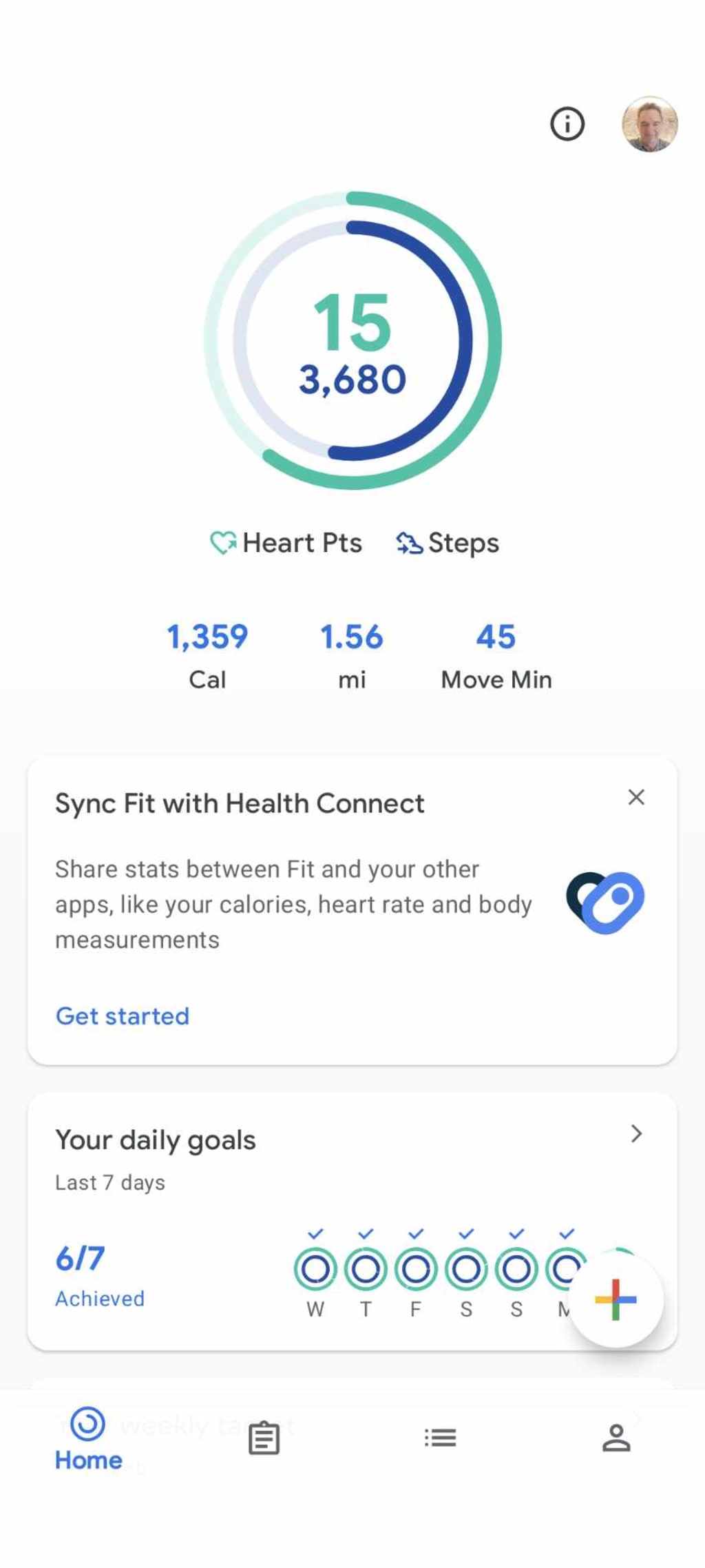 Google Fit also has this thing called heart points. It recommends 25 heart points a day / 150 a week, and you get a point for each minute of brisk walking. I usually hit the 25 a day, and often hit 50, and sometimes 100. Yesterday I hit 77.
