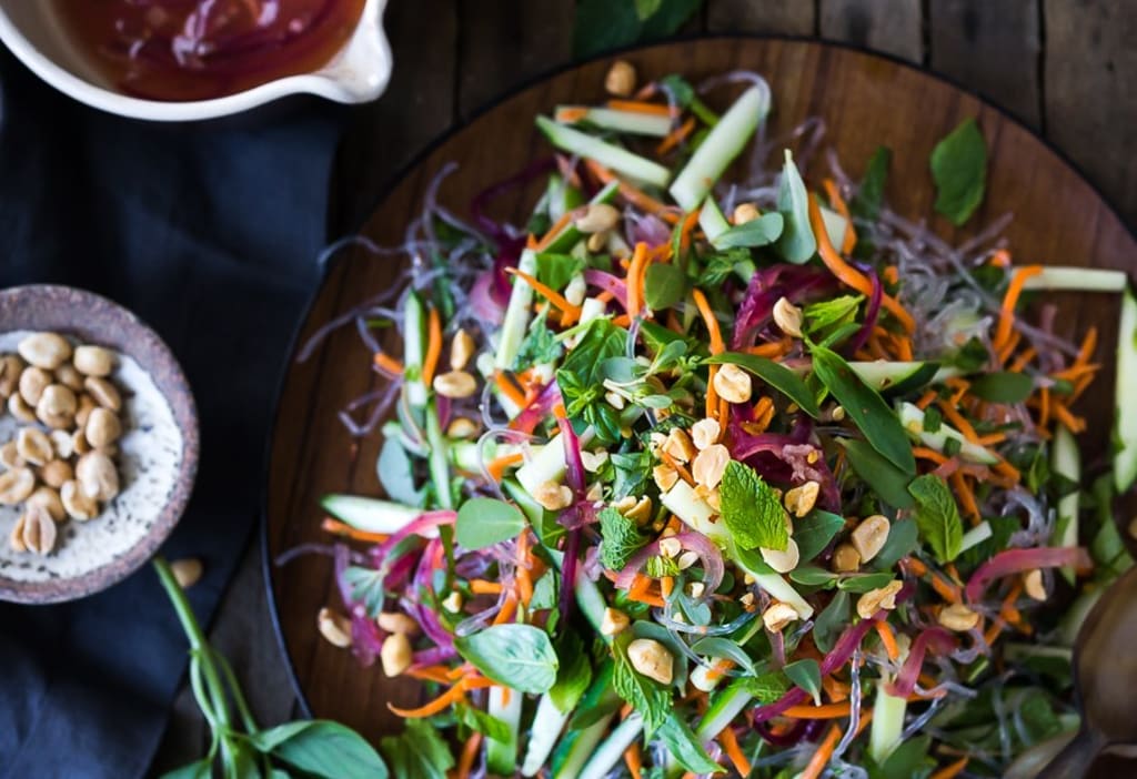 Imagine your favorite fresh spring roll - but in a bowl. So light and flavorful, this Vietnamese Vermicelli Salad with Sweet Chili Vinaigrette is nothing but fresh veggies, herbs, crushed peanuts, and a stunningly dressing. You’ll be craving it constantly. If you don’t want to use vermicelli, you’ve got lots of other options - Feasting at Home suggests trying rice noodles, bean thread noodles, or even “Sea Tangle,” aka noodles made out of kelp. What? That’s too cool. I’m all about the mint, basil, and cilantro that give this salad its intense flavors. You can use whatever veggies you like - crunchy ones are best, like carrots, cucumbers, bell peppers, and radishes. Zucchini noodles, turnips, kohlrabi, and radishes work too. If you omit the fish sauce, this is completely vegan - just use a little salt and soy sauce or a vegan fish sauce substitute for the classic Thai flavor profile.