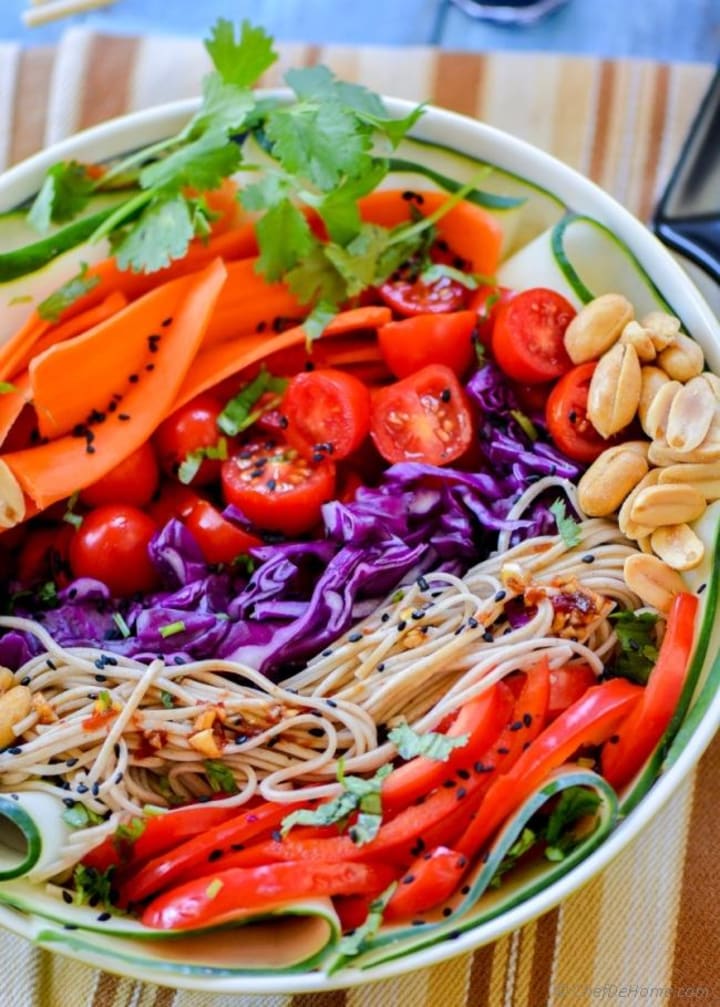 The brilliant mind behind Chef de Home readily admits that this salad is a far cry from the Bánh mì sandwich you’d get at a Vietnamese bakery - after all, Bánh mì is a term used to describe all types of bread, and this salad hasn’t got any bread at all. What it does have is tons of juicy, crisp veggies and gluten-free buckwheat soba noodles mixed up in a spicy chili-garlic dressing and crunchy peanuts on top. When you’re craving the fresh flavors of summer, start by mixing up the dressing, which requires just a few basic ingredients from your cupboard and fridge: garlic, soy sauce (make sure to use gluten-free tamari if you’re concerned about avoiding all gluten), chili paste, and vinegar. Cook the soba noodles - they’ll be ready in less than five minutes. Chop up your vegetables (Chef de Home used carrots, tomatoes, red cabbage, red peppers, and cucumber) and your peanuts. If you want to make the salad completely vegan, the creator suggests substituting a sprinkle of red pepper flakes for the chili paste.