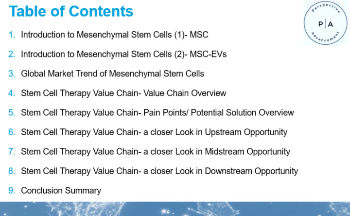 In Part 1, we introduced the concepts of mesenchymal stem cell (MSC) and mesenchymal stem cell-derived extracellular vesicles (MSC-EVs) and explored the market potential in this field. I believe you now have a better understanding of the industry chain as we discussed in Part 1. In this part, we will continue the discussion by covering sections 5 to 9.