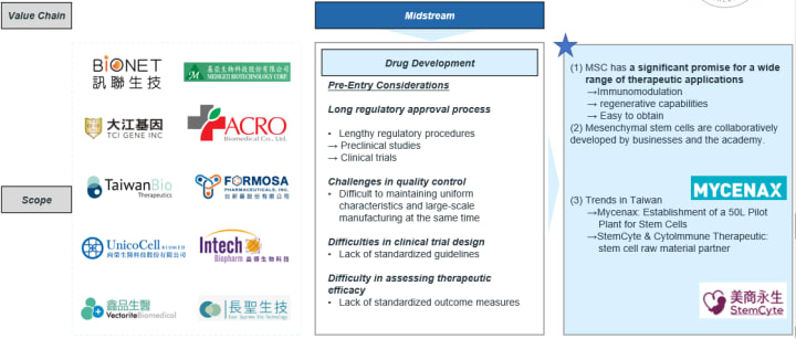 - Compared to pharmaceuticals, stem cell therapy has the opportunity to enter the application stage earlier in Phase II (for some countries).