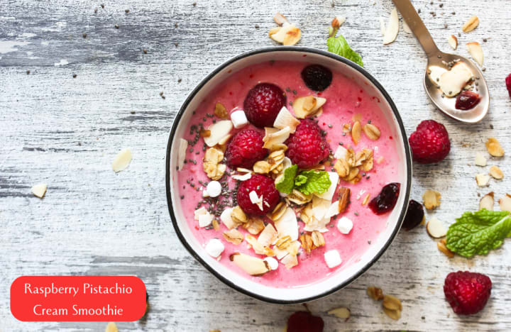 Pistachios are an excellent addition to any smoothie. Not only are they packed with healthy fats and protein, but they also have unique fat-burning powers. In one recent study, two groups followed a nearly identical diet and exercise regimen. Still, the group fed unsalted pistachios had significantly more outstanding results in terms of fat loss than the control group. At the same time, raspberries have potassium, which is essential for the heart to work and helps to lower blood pressure.