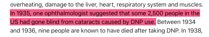 The FDA eventually intervened in 1938 when it became clear that DNP was too toxic, having caused several dozen deaths and, according to one estimate, 2,500 cases of blindness due to cataract by 1935.
