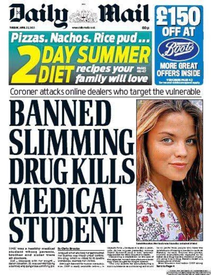 A 21 year old university student, Eloise Parry, was pronounced dead in April 2015 after having taken eight pills of the dangerous fat burner 2,4-dinitrophenol, or DNP.