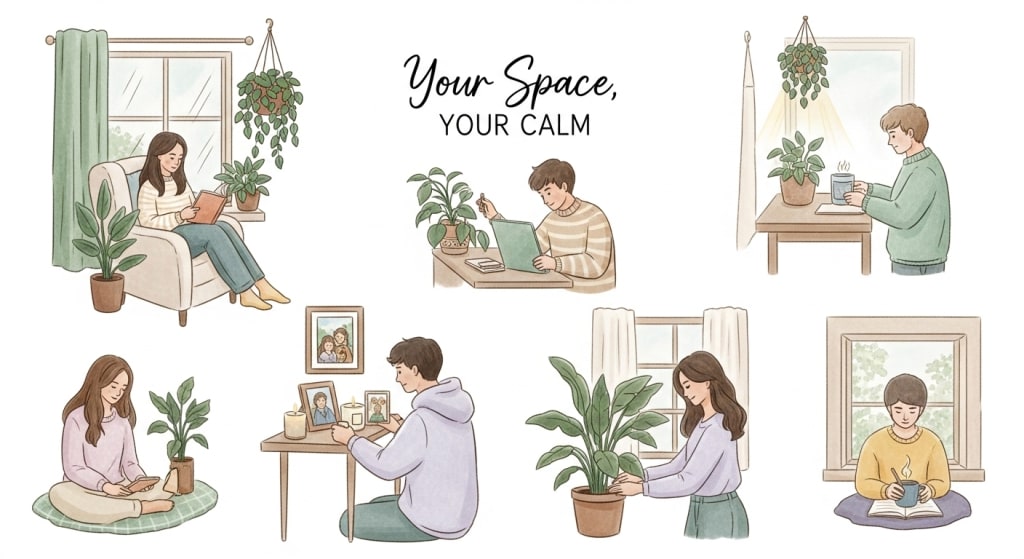 Pick a specific spot—your bedroom corner, a window nook, or even a balcony—for your sanctuary. It doesn’t need to be big; mine’s a chair by a plant-filled window where I sip tea. Claim it as your no-work, no-stress zone.