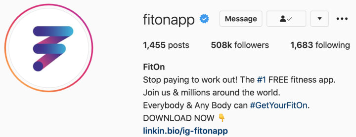 I click on the advert and it takes me to their Instagram page. There is an instruction to download their app: FitOn Workouts and Fitness Plans.