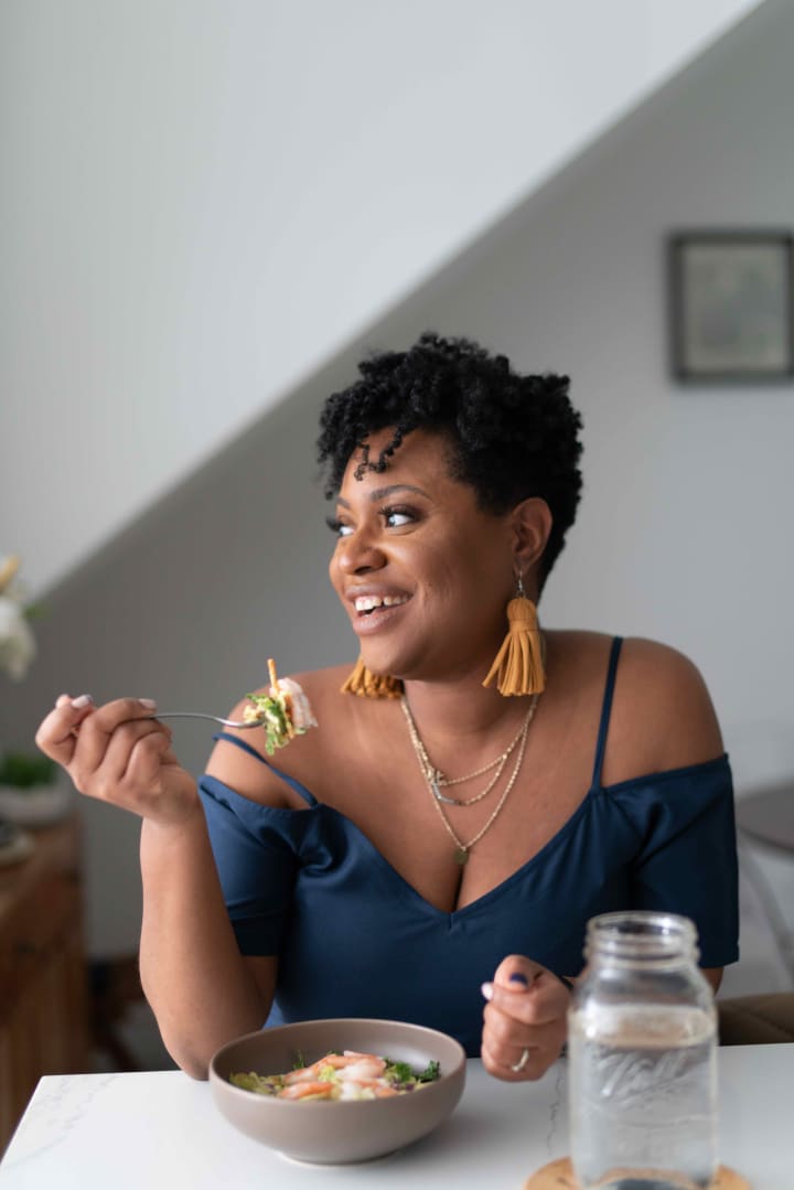 For dinner, I have lean protein like salmon or shrimp, along with some stir-fried veggies and either quinoa or brown rice. I love to roast broccoli, cauliflower, bell peppers, and onions on a sheet pan and have that as my side veggie. I also like to sauté fresh whole green beans. Sometimes I’ll cook cabbage or collard greens in the pressure cooker. Another veggie option is cauliflower fried rice, which I love to pair with shrimp or bay scallops.
