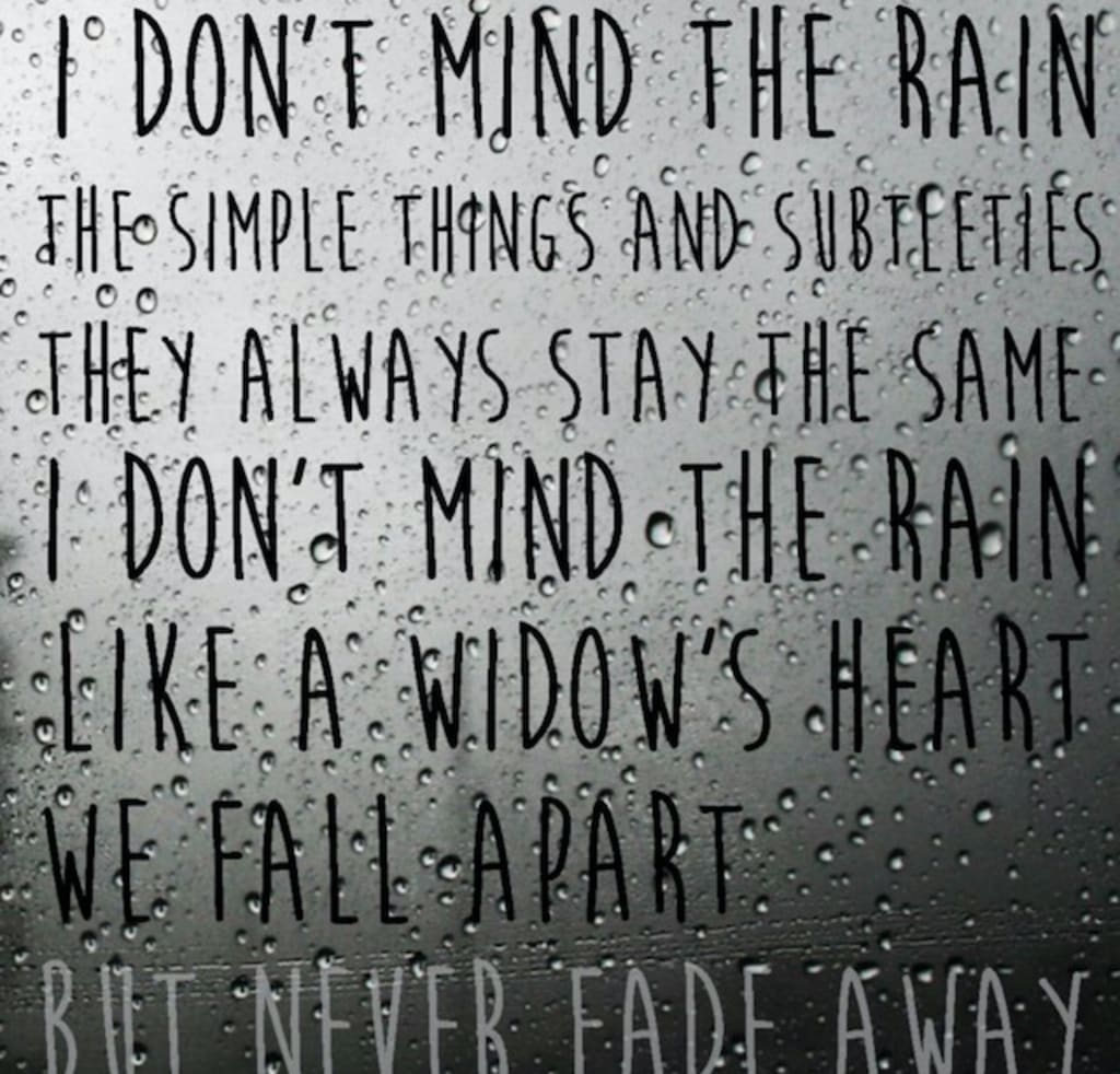 " I don’t mind, no I don’t mind, I don’t mind the rain. Simple things and subtleties, they always stay the same. I don’t mind, that I don’t mind, no I don’t mind the rain. Like a widow’s heart, we fall apart, but never fade away. Run like a child do you know where I came from? No I don’t, but I’m singing all the same songs. I’m alone, and you’re looking for your anyone. Does it hurt just to know that it’s all gone? I can feel the pain in the words that you say. Hidden in the letters that were written to no name Let me be the hands that you hold to your face. 'Cause I’d give it all up if I could take it away. Buried in red, white, and a side of some blue Some will die too late, and somebody too soon. If he could come back, we’ll see what it cost him. We had to lose it all, just to know that we lost one. Hi, I’m just a shape in the shadow of grates. Hi, I’m just a voice in the choir of saints. Oh all the souls that nobody could save And just like a light, we faded away ......................"