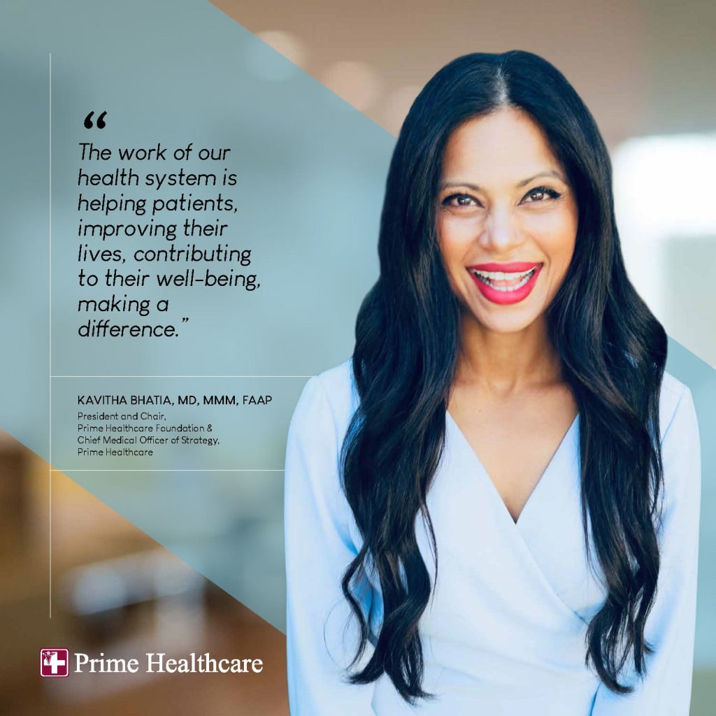 Kavitha Bhatia, MD, MMM, FAAP, President and Chair, Prime Healthcare Foundation & Prime Healthcare’s Chief Medical Officer of Strategy, was recently featured in Becker’s Hospital Review.