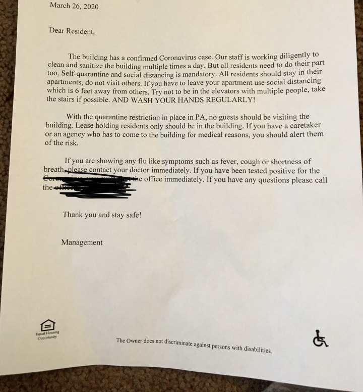 Immediately after reading the letter, I pulled out my smart phone from my coat jacket and text my manager that I received a letter about a COVID-19 patient living in our building. She replied “we all got the letter “but it was what happened afterwards that shocked me the most.