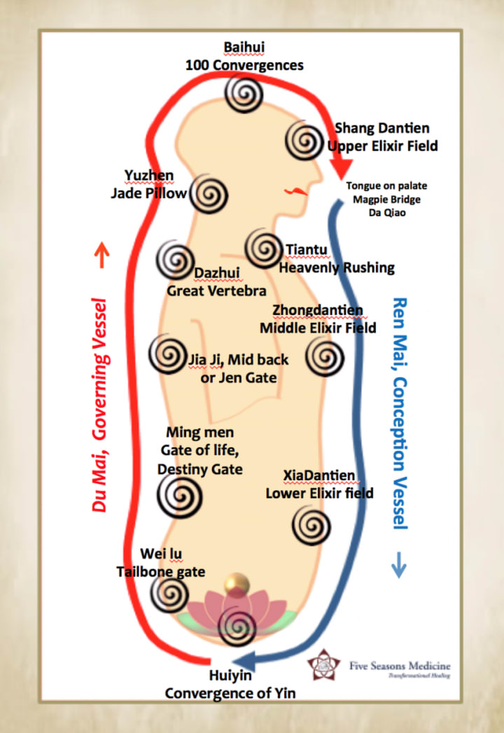 Imagine a golden light being drawn through into your mouth, working its way down each point highlighted on the image above. With each breath the golden light moves further around the circuit until it meets the tip of your tongue again and let the cycle continue the whole time you are meditating. This allows the energy to pass all the healing points around the body.