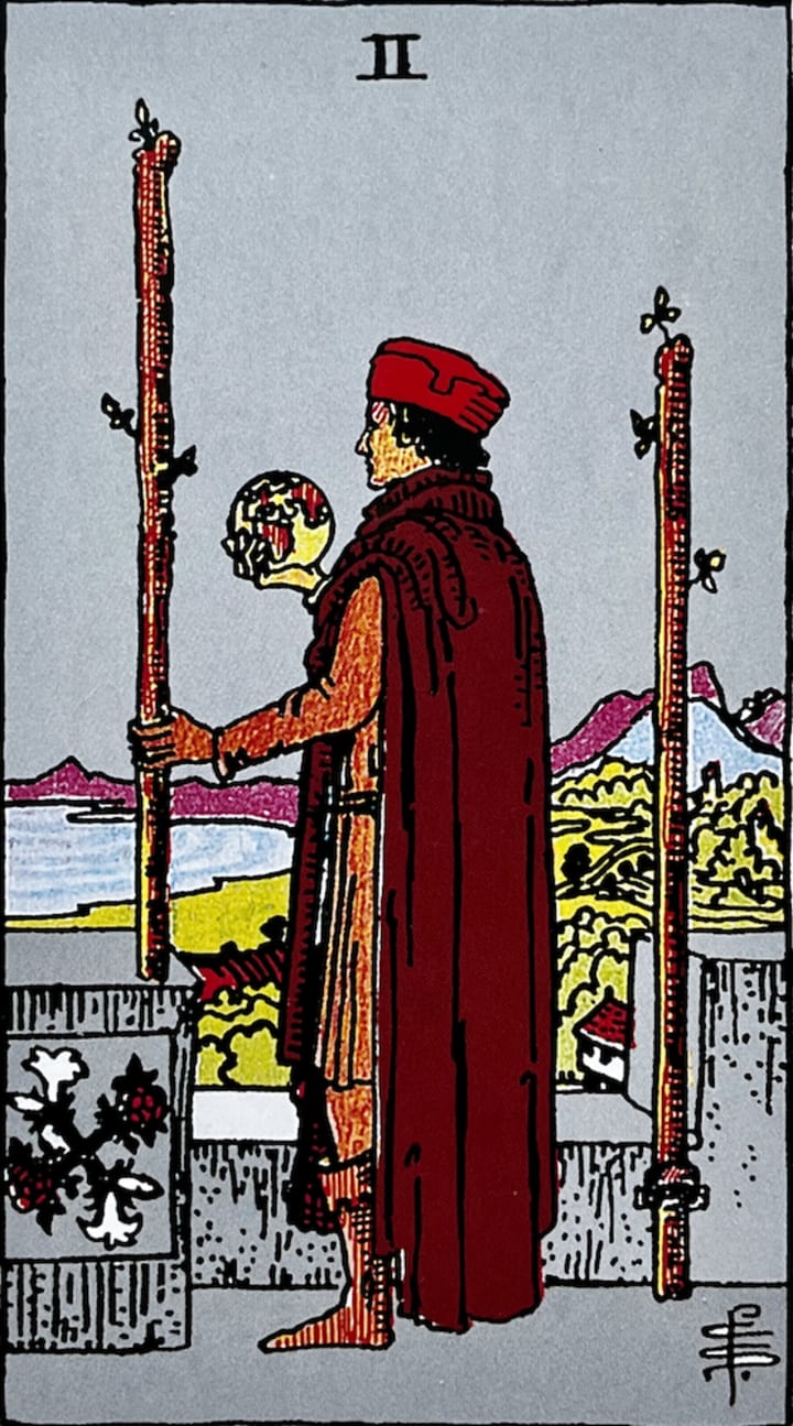The Two of Wands shows a man standing on a balcony holding a wand in his left hand, the hand of intuition. In his power hand, the right hand, he holds a globe. He stares out at the world from his balcony over a shoreline view. The view in the background reminds me of the view from a hotel in Waikiki, Hawaii. The man appears to be in thought. Perhaps he is planning something or working something out. The suit of wands is about creativity and action, so he is most likely creating something or working on something creative in his mind that will soon be put into action.