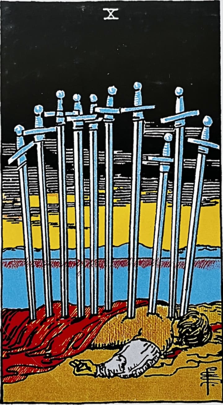 I often call this card “The Party’s over!” card. And it’s really over! It doesn’t get more final than having ten swords stuck into you. Tens are about endings that lead to new beginnings. Similar to the way we tend to view the day cycle. It’s not a new day until the sun rises. Before that, it was still nighttime. We see that as night even that minute just before the sky gets brighter. And this card is like that. It’s the moment just before the new day begins. Just before the sky gets lighter and the sun peaks above the horizon, this card signals an end so that something else can begin.