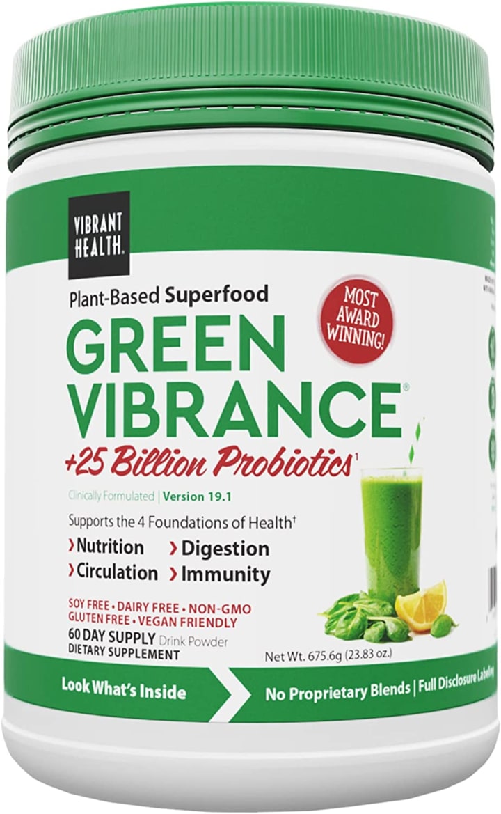 Vibrant Health Green Vibrance is an all-natural, vegan superfood powder that is packed with essential vitamins, minerals, probiotics, antioxidants, digestive enzymes, and more. This superfood powder is designed to provide your body with the vital nutrients it needs to stay healthy and energized. The combination of plant-based proteins, natural superfoods, and prebiotics helps to enhance digestion, increase energy levels, and reduce inflammation. Furthermore, the product is gluten-free, non-GMO, and contains no added sugar. Enjoy this delicious and nutritious superfood powder in smoothies, oatmeal, yogurt, and more, and let Vibrant Health Green Vibrance help you live a healthier and more vibrant life.