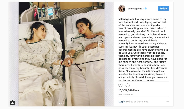 While Selena Gomez was giving back this week to Hand in Hand, helping to raise money for victims of Hurricane Harvey, none of her fans knew she was still recovering from a life-saving operation. Gomez kept silent about the surgery until revealing to her 126 million followers on Instagram that she'd undergone a kidney transplant this summer.