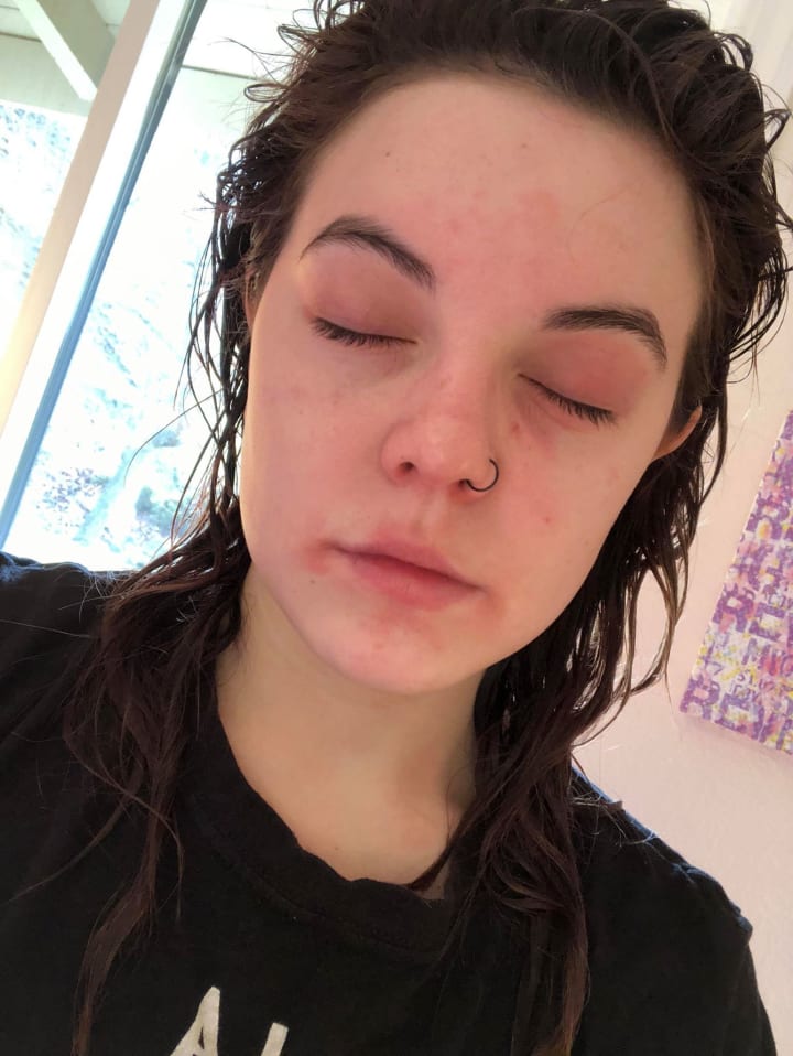 A few months later, my family and I moved to Oregon. Everything was going fine, until I began getting these weird horrible rashes all over my face. Except, they were more than rashes. They looked like acne in some spots, but they weren't acne. The corners of my lips were split open, oozing these weird liquids, all my skin was peeling, and there were huge red circles of scab like skin. My lips itself were swollen, and oozing. My eyes were huge. So huge, I couldn't look up or down. They were bright red, and itching, as well as scabbing and oozing. It went on line this for months. From September to April to be exact.