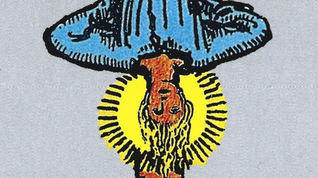 Our first card today is The Hanged Man. This card is an interesting one. It features a man hanging upside down by one leg. His right leg is crossed behind his left, and his arms are crossed behind his back. He has a very peaceful look on his face. I don’t think he’s there by force. I think he’s there because he wants to be. He hangs from a T-shaped tree. And I call it a tree because of the leaves hanging off either side of the two branches. It’s an odd-shaped tree, but I would call it a tree instead of a cross.