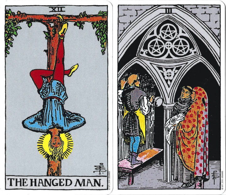 Our advice card is the Three of Pentacles. This card features a man standing on a bench. He has one hand on the wall and holds something in his other hand. I’m unsure what he’s holding; it could be a tool. The other two people in the card, A male figure, are dressed in a dark robe while the other, a female figure, is dressed in an orange-ish robe. These two are holding a document that looks like a blueprint or a drawing. The three pentacles are carved into the building they’re in.