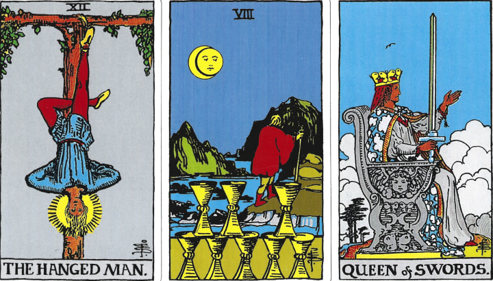 Today’s reading is a clear example of just that idea. I meditated on the date. February 2, 2023. I thought of nothing else but these numbers, this idea as I shuffled the cards as I always do. The three cards that revealed themselves to me are the Hanged Man, the 8 of cups, and the Queen of Swords.