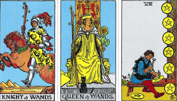 Our first card, the situation card, is the Knight of Wands. He looks like a good young man, charging into the situation. But not forcefully it’s more of a “golly-gee” kind of vibe I’m getting. It’s the kind of energy you find in teenagers and young adults who want to conquer the world and do amazing things. It’s the kind of energy you want to support but you also know from experience that they’re going to get heartbroken. You want to warn them but you know they won’t listen. And it won’t help either. This is the process all young people have to go through. This card is the rose-colored glasses. It’s full of optimism with a gung-ho vibe. The yellow robe he wears is a symbol of that optimism and the red horse is all about passion and Vitality. It’s also a card about creativity. This card is showing us something creative, something that we are passionate about. Something that we love and we love doing.
