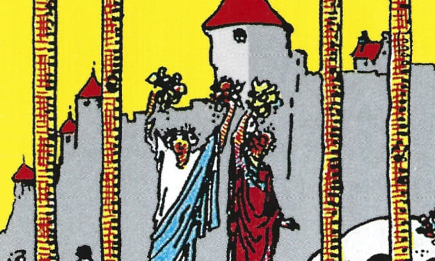 This card talks about worry and the need to set up boundaries. You have the man who looks worried. And maybe he should be. He’s been in battle, got some scratches, and now come out the other side of it. Nine is a number about wisdom and caring. It’s also the last of the single-digit numbers. So it can also speak to us about coming to the end of something. And that’s what this card feels like to me. Coming to the end of something and needing to protect it a little. It’s almost done and we just have to hang on a little bit longer.