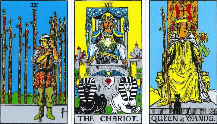 Our final card is the Queen of Wands. She is beautiful and regal. Confident and collected. She has no fears or worries. Her yellow robe is a symbol of optimism. There is a great blue sky behind her with no clouds. She sits on her throne which is on a stone slab. This indicates she is grounded and stable. The lions on her throne are a symbol of courage and strength. Which she has in spades. The black cat in the foreground could be something to worry about except that she’s not worried about it. She’s not even looking at the cat. This card is telling us to be like the queen here. To be confident and calm. To collect our thoughts and remain true to who we are and what we do. To be ourselves and to be confident in that.