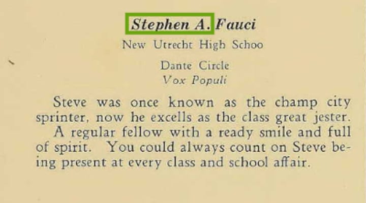 Dr. Anthony Fauci was born December 24th, 1940 in Brooklyn, New York to Stephen A. Fauci and Eugenia Abys. Dr. Fauci attended Regis High School on the Upper East Side of Manhattan where he was the captain of the school's basketball team. After High School, Dr. Fauci attended the College of the Holy Cross in Worcester, Massachusetts where he earned an Bachelor of Science Degree in Classics in 1962. While attending Holy Cross, Fauci made Dean's List, and was a member of the Outing Club, the Aquinas Academy, the Knights of Columbus, the Biology Society where he served as Treasurer, and was on the Junior Prom Committee.