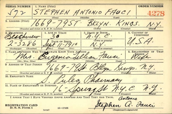 Antonio Fauci was born in 1876 in Sciacca, Italy to Pierto Fauci and Accursia Abruzzo. Cologera "Lillie" Guardino was born in 1873 in Sciacca, Italy to Pierto Guardino and Calogera "Lillie" Guirreri. Lillie immigrated to the United States in 1890 from Italy when she was just 17 years old. Antonio would do the same in 1900 when he was 24 years old. Antonio and Lillie married on April 19th, 1902 in Manhattan, New York when Antonio was 26 and Lillie was 29. According to the 1920 United States Census, the Faucis would later move to 1646 81st street in Brooklyn, New York. During this time, Antonio was in the process of obtaining citizenship in the United States and had submitted his paperwork to do so. During this time, Antonio is listed as working as a bookkeeper in the contracting industry. By 1940, Antonio and Lillie moved to 1669 79th Street, in Brooklyn. By this time, Antonio was working as a contractor but had officially become a citizen of the United States.