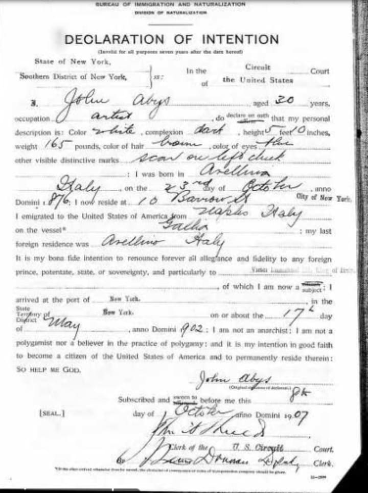 Giovanni Abys was born on October 23rd 1876 in Italy to parents whose names are unknown. Rafaella Trematerra was born in 1884 in Naples, Italy to parents whose names are unknown. Giovanni immigrated to the United States on May 17th, 1902 on board the Gallia. Around the same time, Rafaella also immigrated to the United States although an exact date is indeterminable. Once in the United States, Giovanni would start to go by John Robert Abys. This is name he used when he declared his intent to become a citizen of the United States on October 8th, 1907.