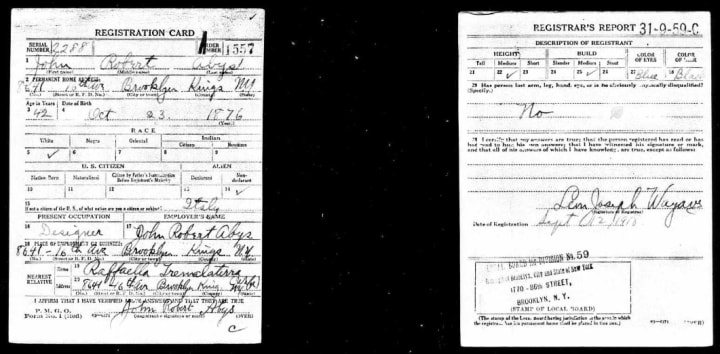 On September 12th, 1918 Giovanni registered for the draft as the United States entered into World War One. At the time, Giovanni is listed as working as a designer in New York, being medium height, medium build, and having blue eyes and black hair.