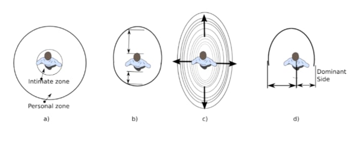 The intimate distance and the “close phased” personal distance are a sensitive issue for most people. If violated, one could feel anxiety, defensive, discomfort, arousal, or intimidation.