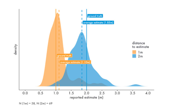 The UK’s Behavioural Insights Team wanted to check how good are people at estimating 1 meter and 2 meters. It turns out people usually underestimate 2 meters and overestimate 1 meter. It seems like a 1-meter distance works in terms of perception, albeit estimating the correct distance might require a bit of time.